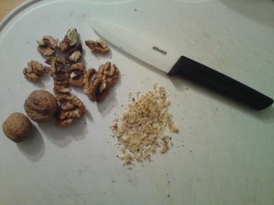 Nüsse hacken für meine Rhabarber-Apfel-Walnuss Konfitüre.